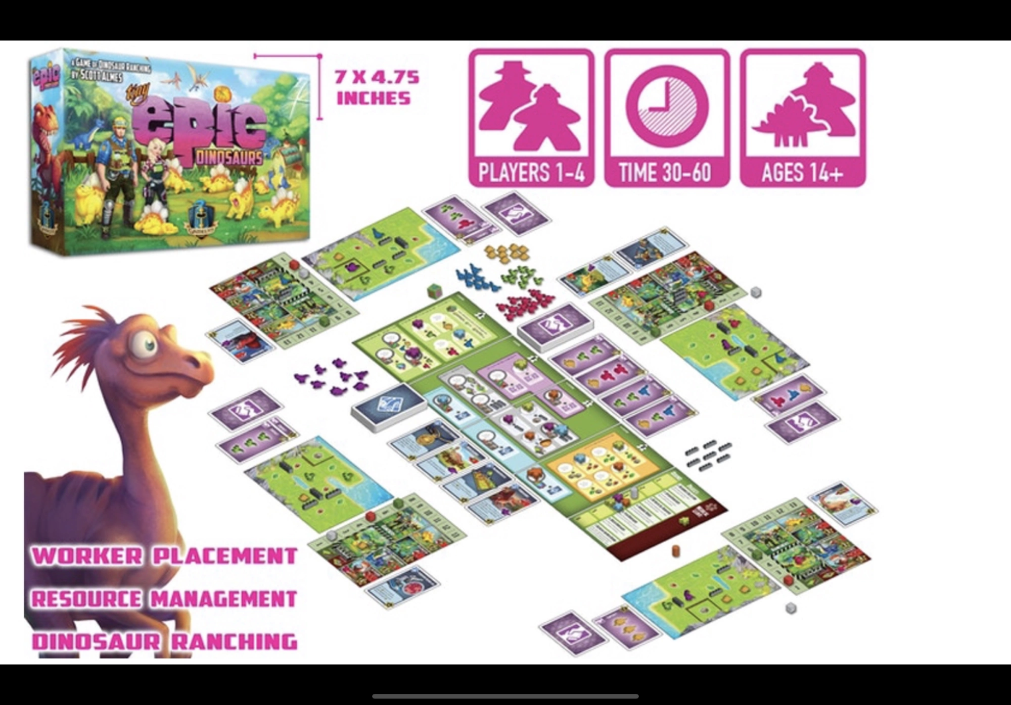 Tiny Epic Dinosaurs er et spil på 45 minutter, 1-4 spillere, med dinosaur-ranching, medarbejderplacering og ressourcestyring. Det har klassiske eurospilmekanikker med unikke vendinger, der skildrer farerne ved at opdrætte disse forhistoriske dyr.