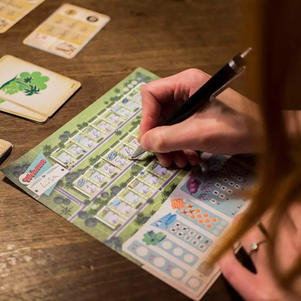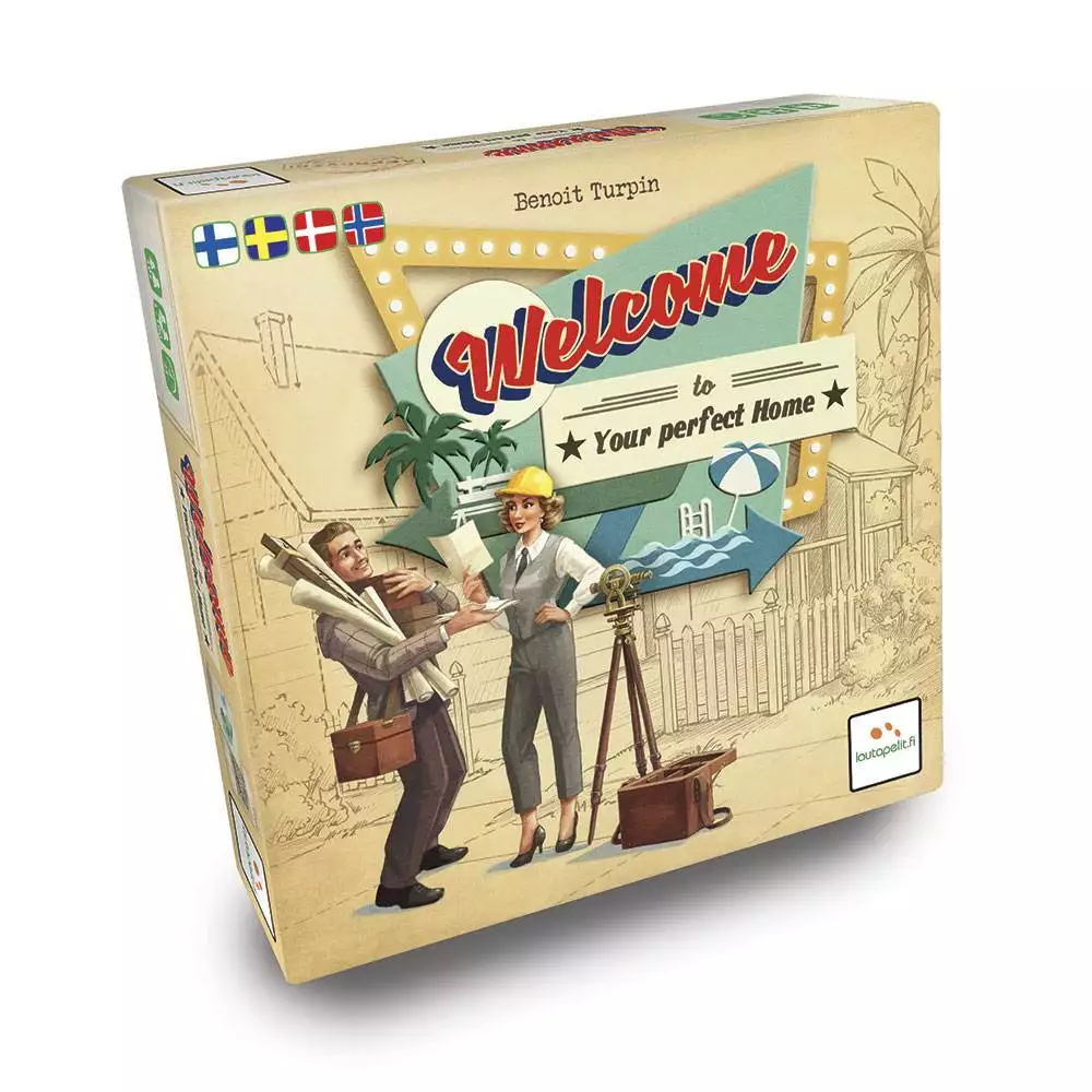 Welcome To … spiller som et terningkast, hvor du markerer resultater på et score-ark … men uden terninger. I stedet vender du kort fra tre bunker for at lave tre forskellige handlingssæt med både et husnummer og en tilsvarende handling, hvorfra alle vælger et. Du bruger nummeret til at udfylde et hus på din gade i numerisk rækkefølge. Derefter tager du handlingen for at øge pointværdien af ejendomme, du bygger, eller score point i slutningen for at bygge parker og pools. Spillere har også mulighed for at tage handlinger for at ændre eller duplikere deres husnumre. Og alle kører for at være de første til at gennemføre offentlige mål. Der er meget at gøre og mange veje til at blive den bedste forstæderarkitekt i Velkommen til …!